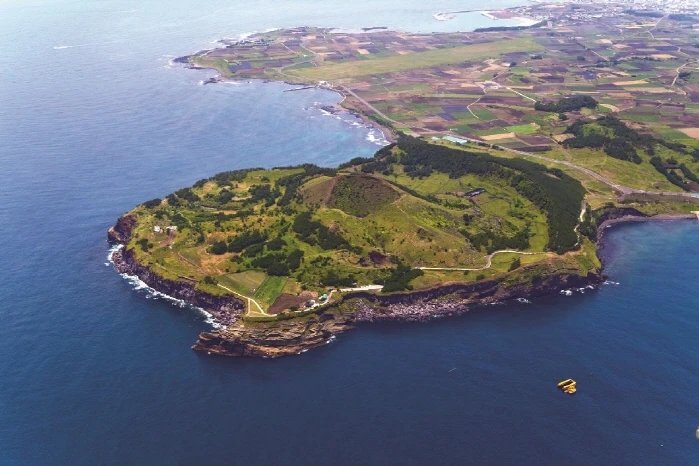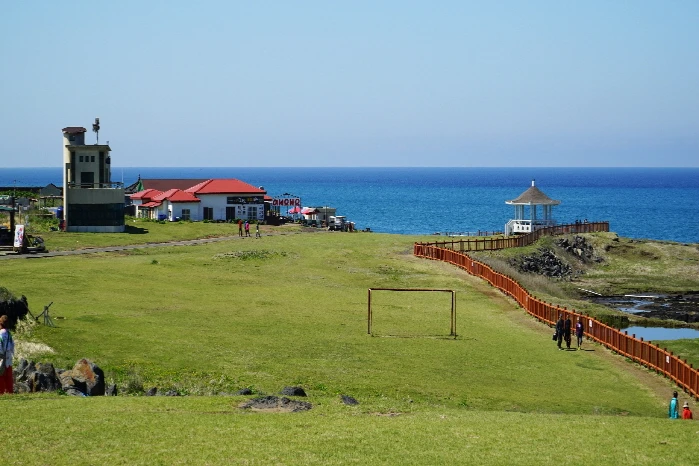 산방산의 남쪽, 가파도가 손에 잡힐 듯 보이는 바닷가에 불끈 솟은 산이 송악산이다. 99개의 작은 봉우리가 모여있어 일명 99봉이라고도 한다. 세계적으로 유례가 드문 이중 분화구-1차 폭발로 형성된 제 1분화구 안에 2차 폭발이 일어나 2개의 분화구가 존재-의 화산지형이기도 하다. 자료출처 : 비짓제주(https://www.visitjeju.net/kr) 펜션에서 14.8km, 차량으로 약 22분